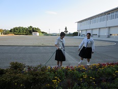 花壇が乾いていることに気づいた部員が、水やりをして帰っていきました。
