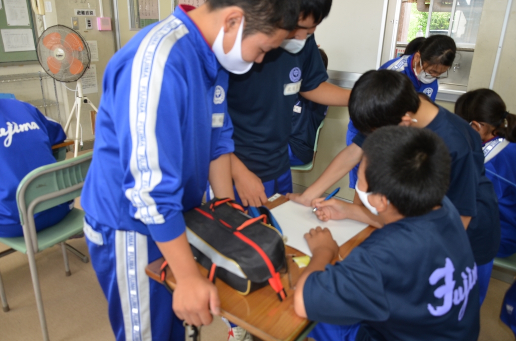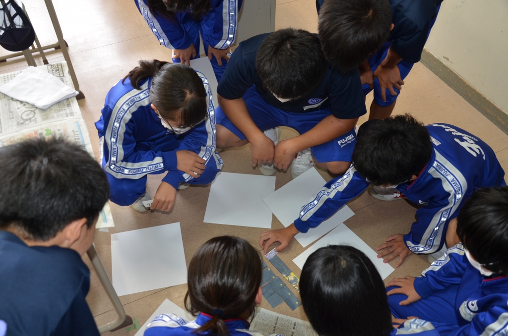 2年生が完成図を組み合わせ、話し合いを行っている様子