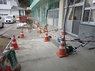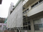 (間仕切りされた職員室内) (校舎東側設置の外部足場)(来校の際は校舎前が通れます)