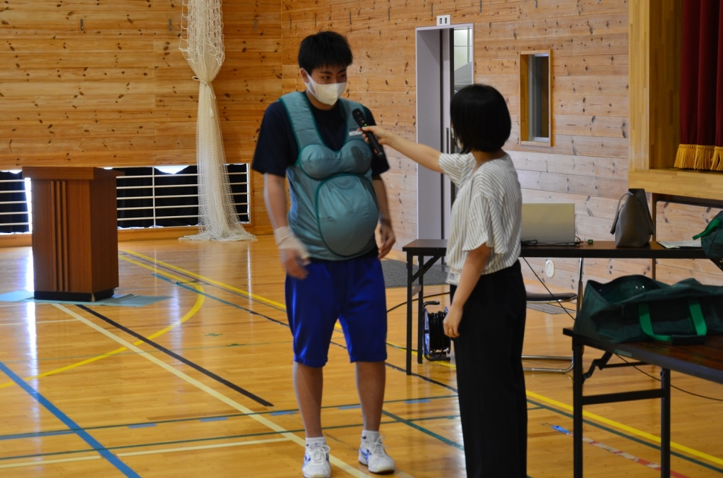 妊婦体験ジャケットをまとい、その重みを感じていました。