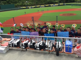 野球部員7人が、8月1日(月)南部スタジアムで行われたメキシコ代表対パナマ代表の試合を応援しました。 メキシコチーム応援のキャプテン校の大野中さんと一緒に、暑い中一生懸命に応援しました。メキシコの方とスペイン語を交えて一緒に応援をする場面もあり、普段できない体験をすることができました。そして、各国の代表チームのレベルの高いプレーをみて勉強することができました。結果はメキシコが勝利。皆で歓喜の声をあげました。 全校生徒がつくった千羽鶴が垂れ幕と一緒に飾られました。