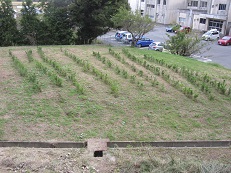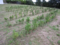 6月末にフクシマ環境未来基地の職員の方々と、本校JRC部員が植樹した、校舎裏の300本の松苗が、順調に育っています。