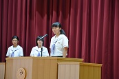 始業式では、校長式辞のあと、各クラスの代表生徒(1年:吉田こはるさん、2年:渡邊愛理さん、3年:大谷寧彩さん)