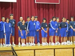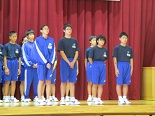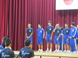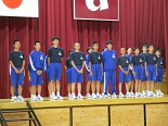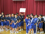 本日5校時の全校集会で、駅伝大会と新人水泳大会の激励会を行いました。選手たちは、一人一人抱負を述べました。3年生の応援団が大きな声で応援を行い、駅伝部主将 木田誠夢くんがお礼の言葉を述べました。自己ベストを目指して頑張ってほしいです。 その後、生徒会が、「福島議定書」について説明し、クイズを交えて楽しく節水や節電を呼びかけました。